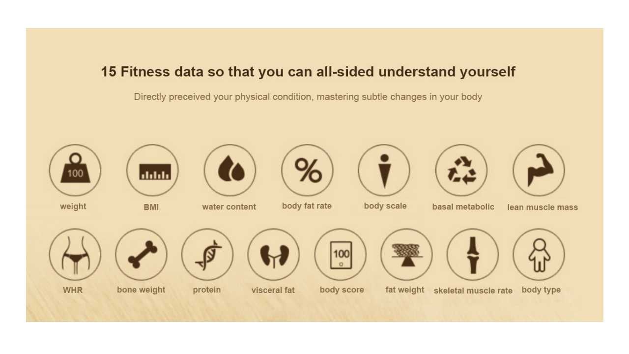 Surface Ground:Hard floor Wireless Mode:Bluetooth LE 4.2 Dimension:300*300*25mm Capacity:0.2~180KG (0.4~400lb) BIA technology:Dual Frequency Accuracy:50g (<100KG) 100g (100~180KG) Conductor:4 x ITO Surface:Ultra transparent toughened glass DisplayHeart Rate:LED Display for Weight Power:3*AAA Battery/Rechargeable lithium battery